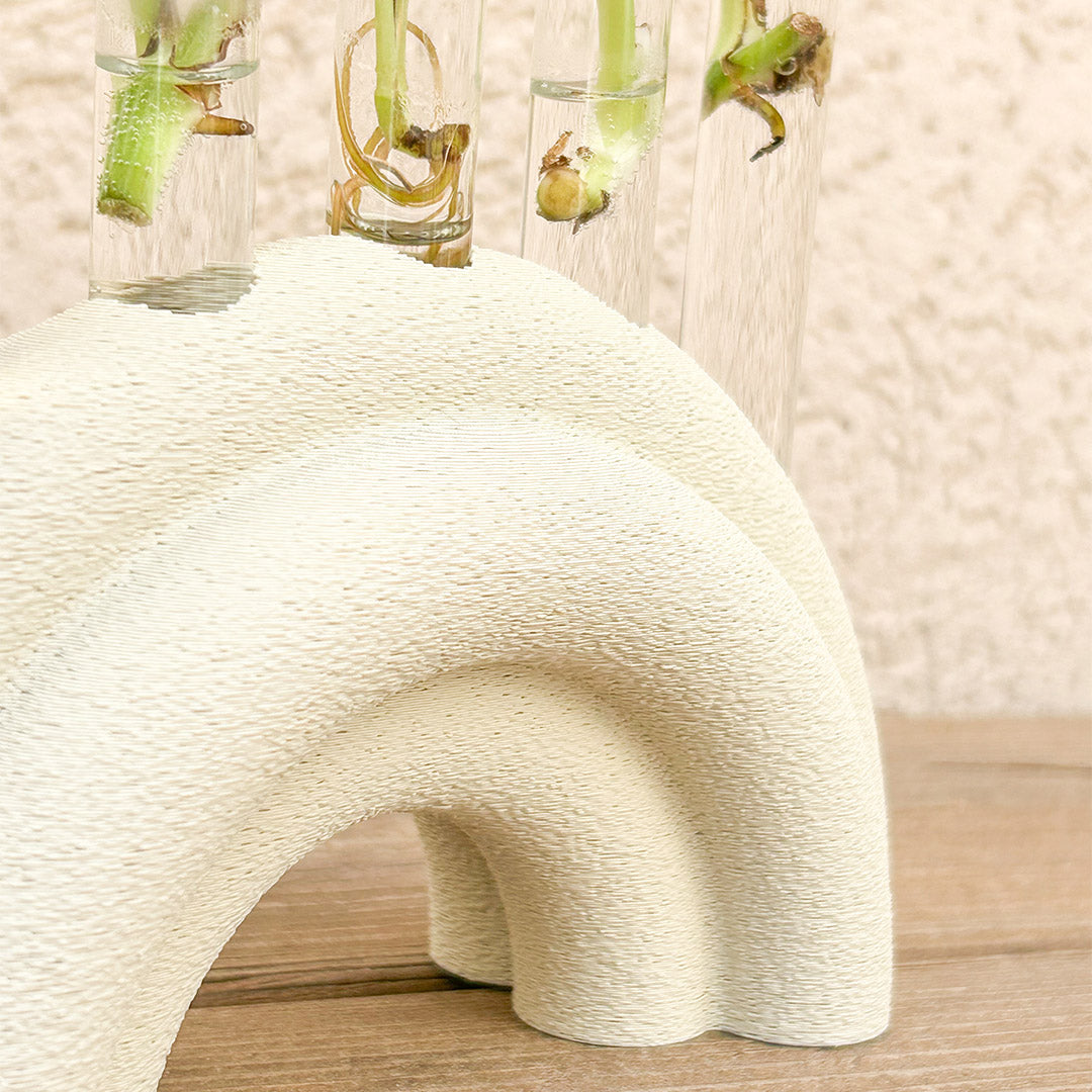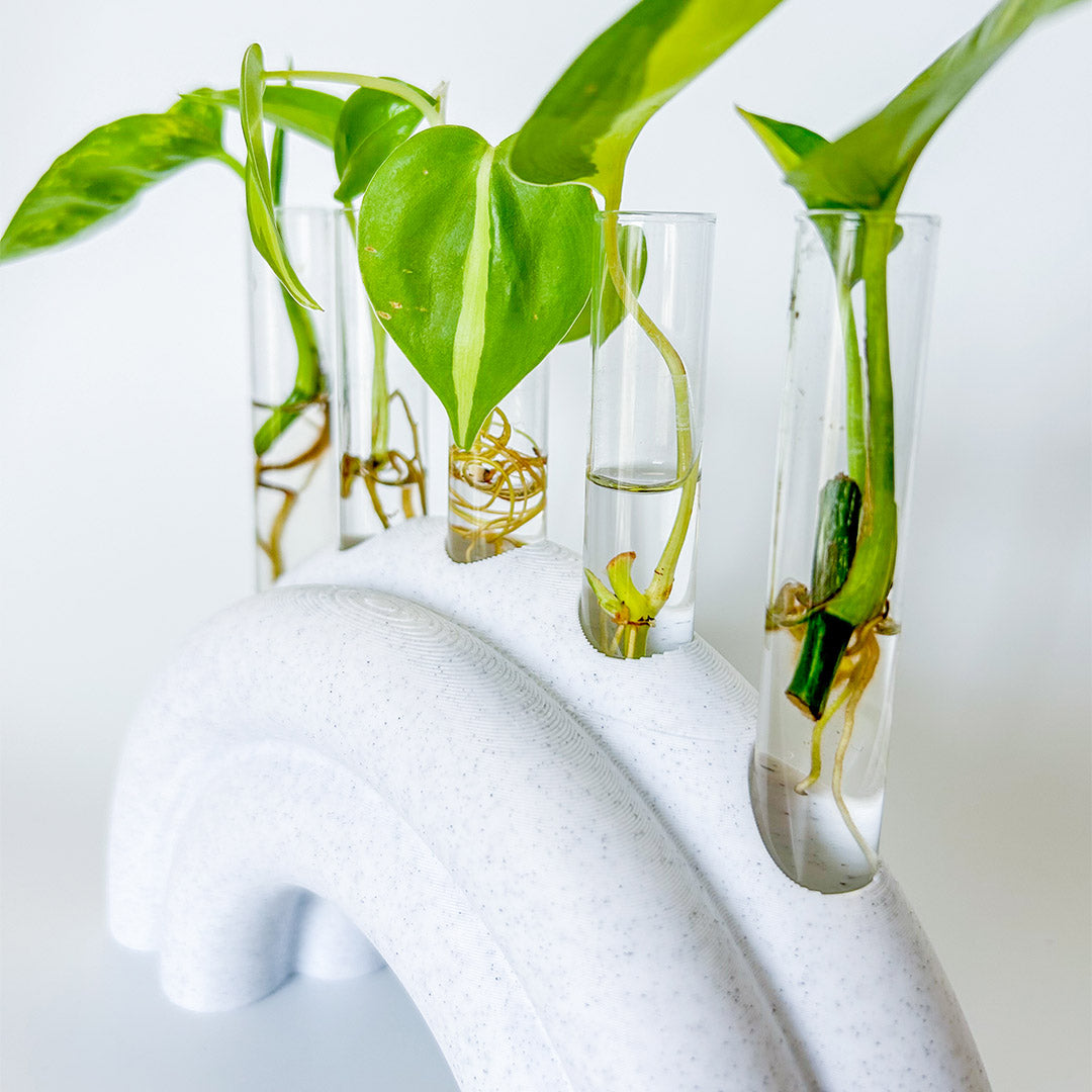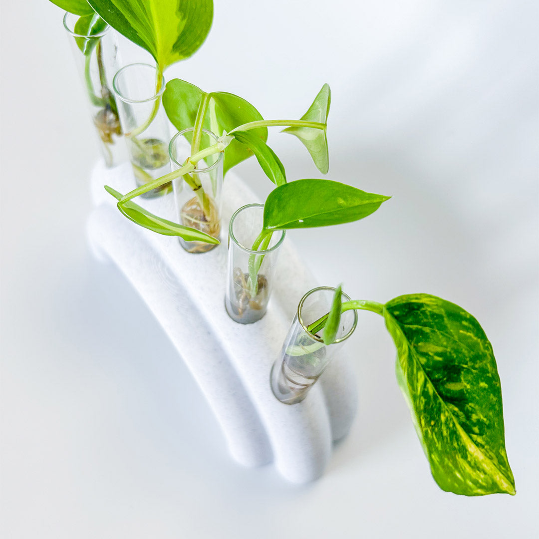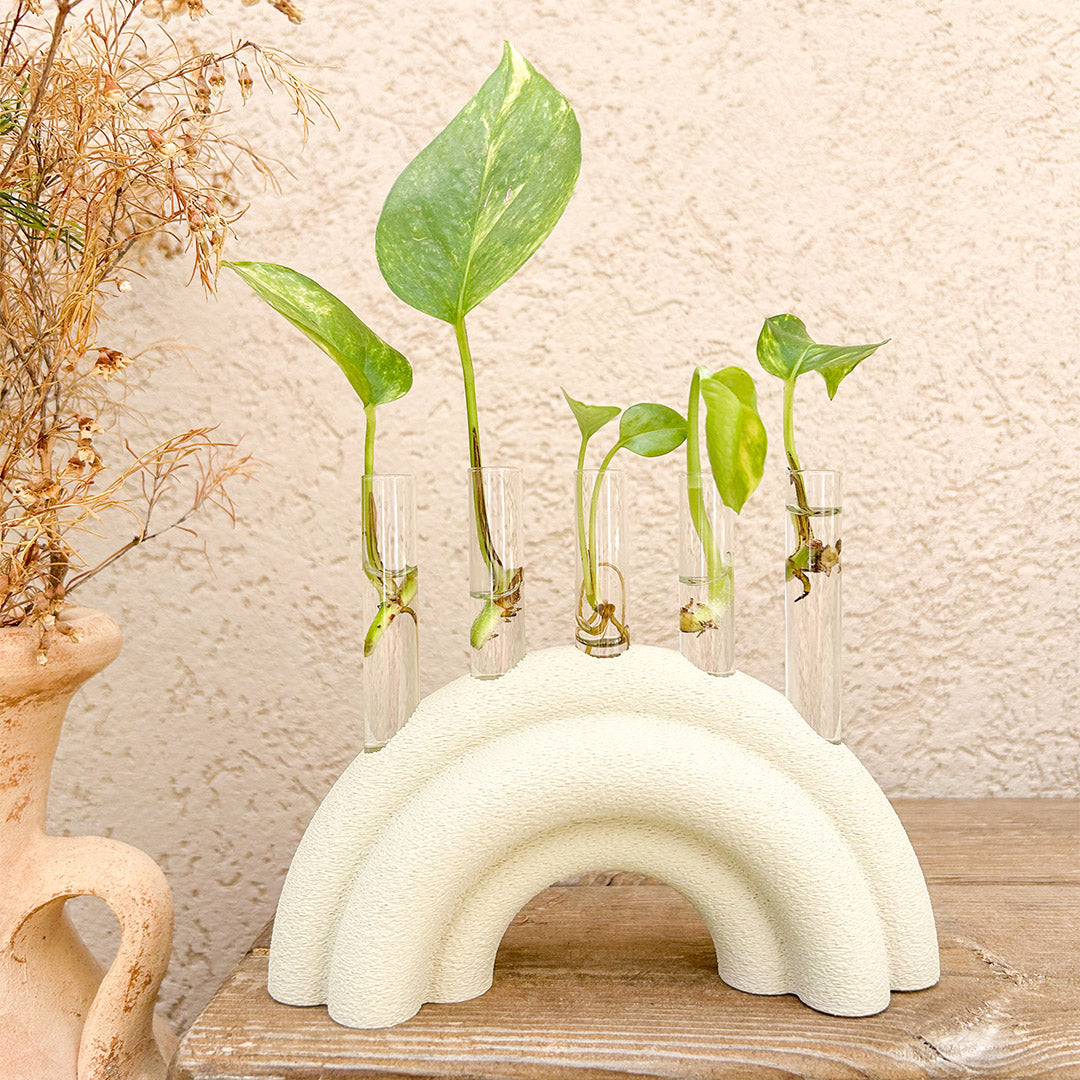 מתקן הנבטה שולחני בצורת קשת אסימטרית עם מקום ל- 5 מבחנות זכוכית עבור ייחורים, פרחים טריים או יבשים.