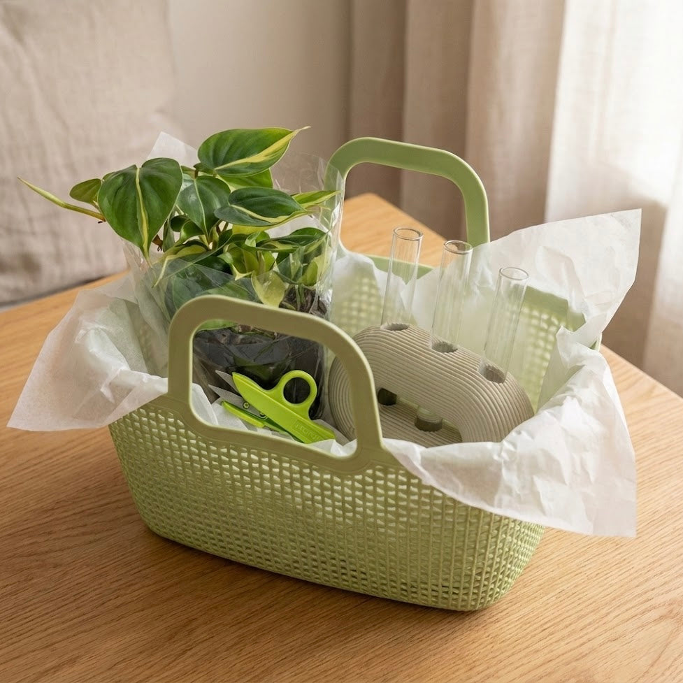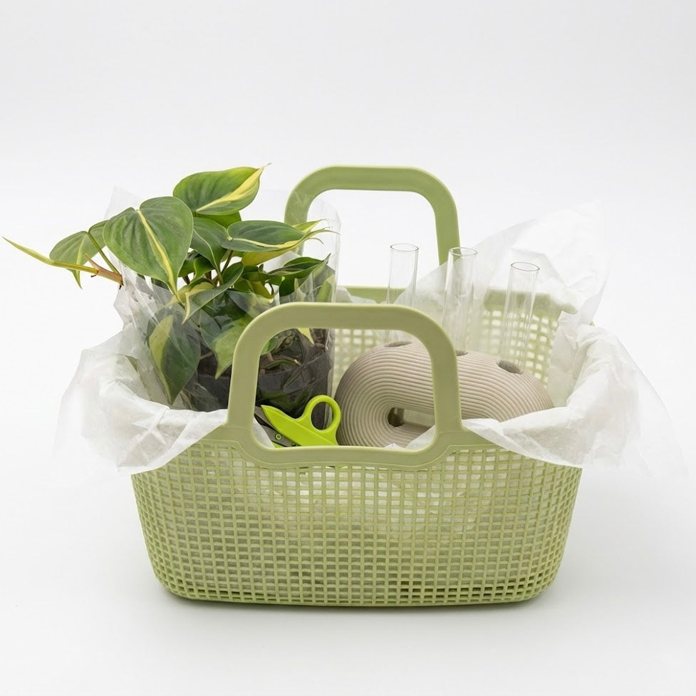 הסלסלה מגיעה מלאה בכל מה שצריך כדי לגדל ייחורים בקלות: עציץ של צמח מטפס (משתנה לפי מלאי) , מתקן טריו מעוצב, מבחנות זכוכית, מספרי גיזום ועלון הסבר.